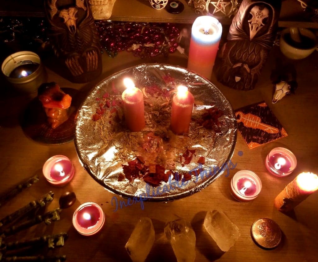 Light the first candle – this being the candle that has the obstacles carved on it. Some folks like to recite a Psalm here (Psalm 23 is very common). Light the black candle first. If you want, recite Psalm 23 – this is very common for this type of work. You may reach out to any Deities that you have worked with in the past, or your very own ancestors. (Do NOT reach out to Deities that you have not worked with before and do not go to your ancestors if have not been venerating them. One of the worst things to do is only go to spirits when we need something with out giving them something back. Do not make that a habit!)